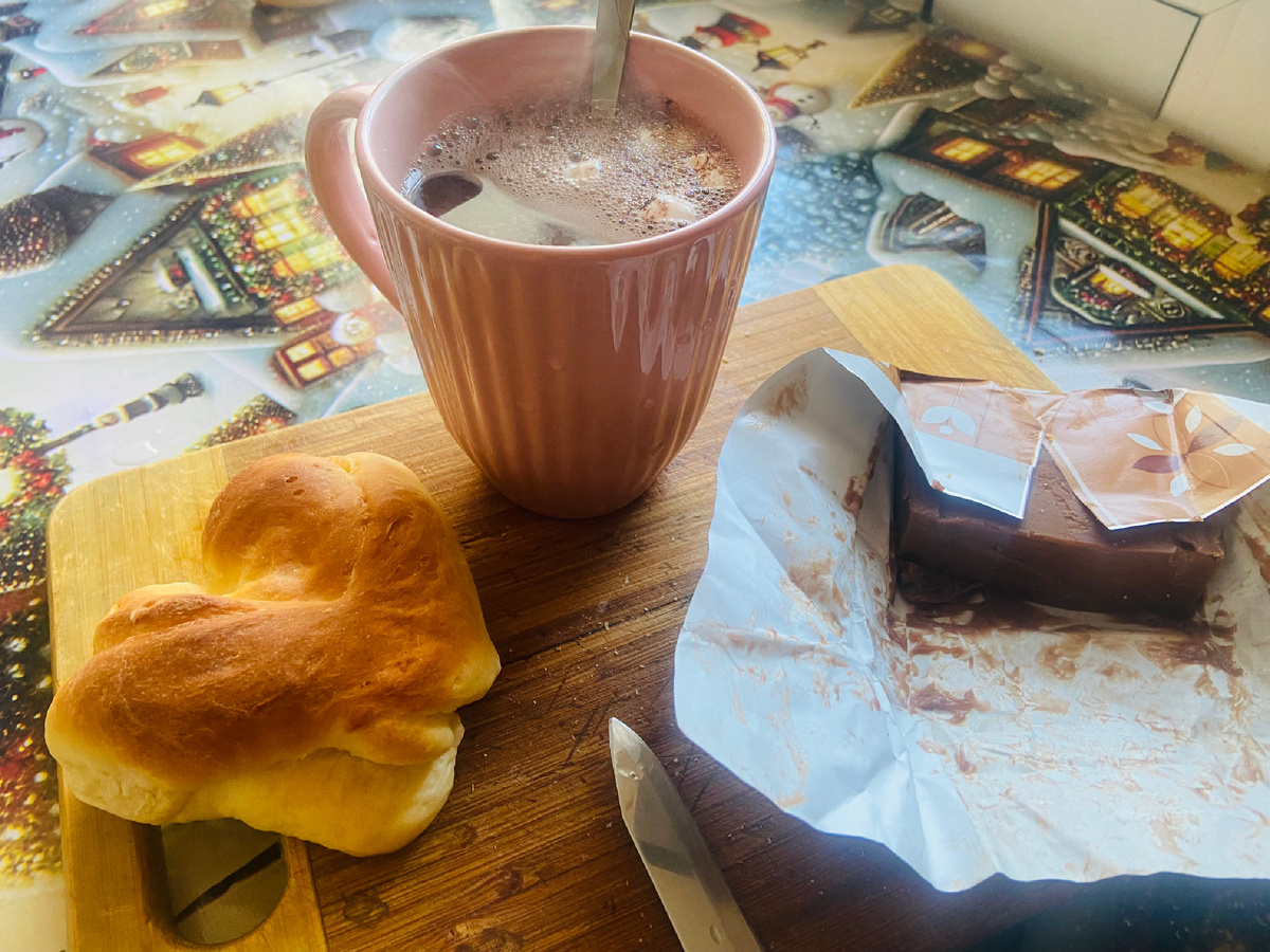 Для поднятия настроения, какао понасыщеннее навела, булку взяла и шоколадное маслице из холодильника достала.