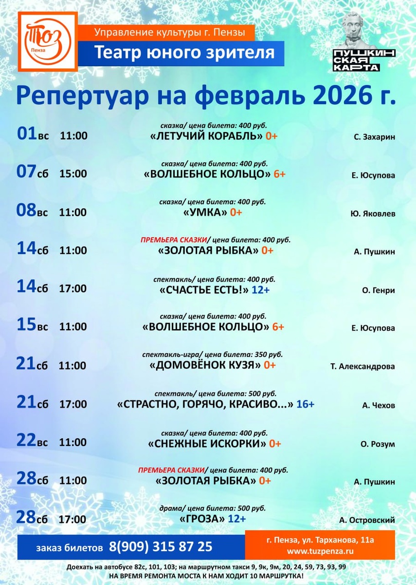 🎭 Уважаемые зрители! Пензенский ТЮЗ ждёт вас в марте! Обратите внимание, на нашей сцене пройдут гастроли Театра драмы для детей и молодёжи "Версия" (г. Саратов)! 🎟 Билеты можно приобрести перед началом показа в кассе (только за наличный расчёт), по ссылке на сайте Пензенского ТЮЗа tuzpenza.ru/ или по ссылке: tickets.afisha.ru/wl/484/api... ❗️Из-за проблем с интернетом электронные билеты необходимо распечатывать или сохранять скриншот. 💳 Большинство спектаклей участвует в программе «Пушкинская карта». 🧾 Цена билетов - 350 - 500 рублей. 👶 Дети до 3-х лет смотрят спектакль бесплатно (только при предъявлении свидетельства о рождении). ☎️ Телефон для справок: 8(909) 315-87-25. (☝️Если решение пойти в театр пришло в последний момент, перед выходом уточняйте наличие билетов по телефону).