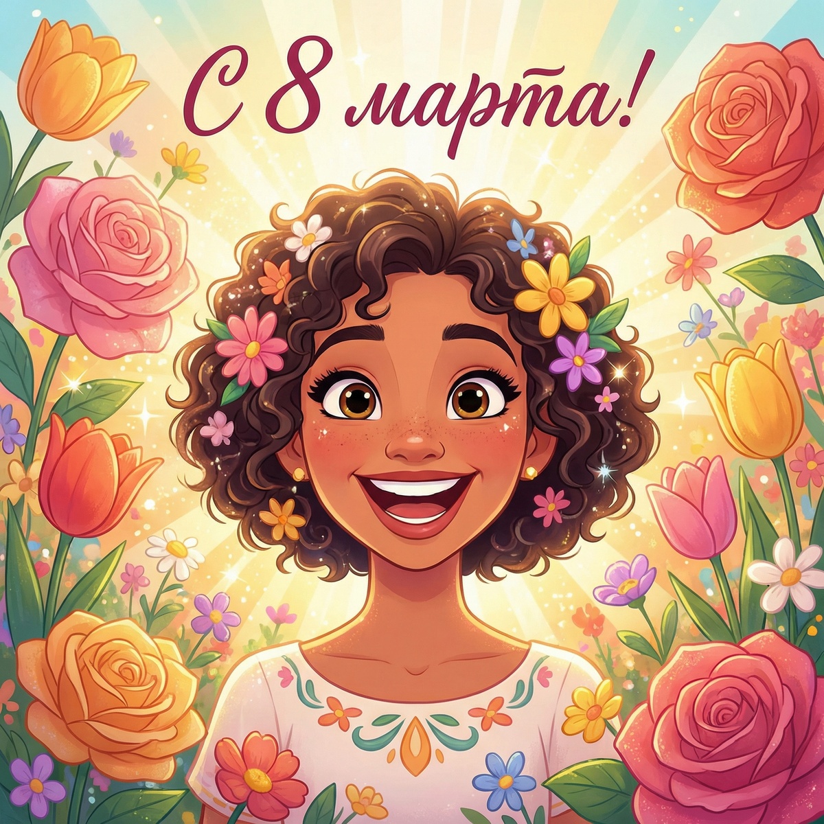 Для мультяшного стиля (как Disney): портрет девушки в мультяшном стиле Disney для поздравительной карточки, яркие цвета, радостное выражение лица, фон яркий цветочный, солнечные лучи и блёстки. Вдохновлённое настроение. Надпись: с 8 марта!