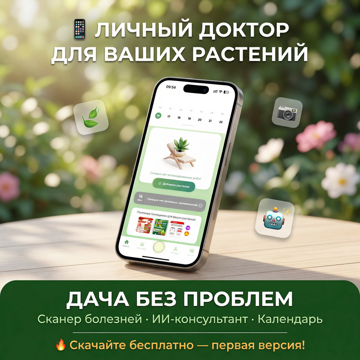 Друзья, это свершилось! Мы запустили первую версию нашего мобильного приложения «Дача Без Проблем». Больше не нужно гадать, почему пожелтел огурец или кто ест вашу капусту. Теперь у вас есть личный ИИ-помощник, который работает 24/7. Что полезного внутри? 1. Сканер болезней и вредителей Просто наведите камеру на больной лист. Искусственный интеллект мгновенно определит проблему (фитофтора, клещ, хлороз и тд.) и выдаст четкую схему лечения. Никаких «может быть», а только точный диагноз. 2. Умный чат-бот Задайте любой вопрос: «Когда сажать морковь в Подмосковье?», «Чем подкормить петунию?». Бот ответит мгновенно, опираясь на базу знаний профессиональных агрономов. 3. Календарь работ Приложение напомнит, когда пора сеять, поливать и обрезать, учитывая погоду в вашем регионе, главное правильно поставить ему задачу. Скачивание сейчас абсолютно БЕСПЛАТНО! Мы только стартовали и очень хотим сделать продукт идеальным для вас. Пробуйте, тестируйте, лечите свои растения! Скачать можно по ссылке