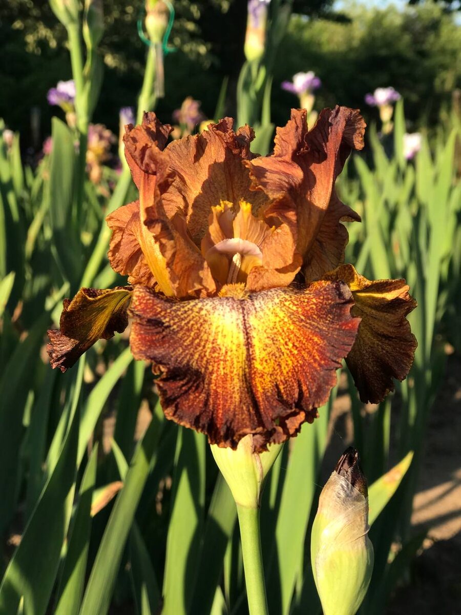 Теплый и уютный, как мягкое сияние свечей — это Holiday Spirit. Стандарты (верхние лепестки) кремовые, с общей промывкой среднего каштанового оттенка; золотистые стили (ветви рыльца) мягко светятся внутри. Ниспадающие лепестки (фолы) с сильной гофрой, полностью покрыты (напылены) насыщенным красновато-коричневым цветом (махагон), становящимся темнее и плотнее к краям. Белая зона вокруг бородок цвета старого золота обильно напылена сливовым оттенком. Цветоносы с тремя ответвлениями и 7-8 бутонами. Срок цветения: Средне-поздний Высота: 86 см. Гибридизатор: Johnson, 2009. ✅ В наличии.
