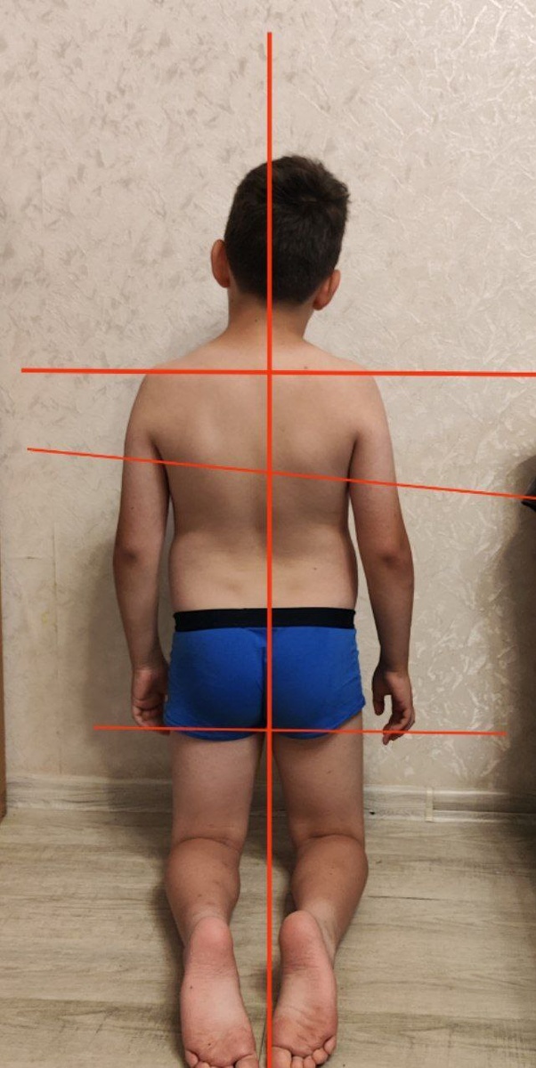 ? Разденьте ребенка до пояса. Поставьте его ровно, руки свободно висят вдоль тела, стопы вместе. Ребенок должен стоять в привычной расслабленной позе. Теперь встаньте сзади и внимательно посмотрите: 🍴 Уши Мы привыкли смотреть на уши спереди или сбоку. А вы посмотрите сзади. Уровень мочек ушей должен быть строго горизонтален. Если одно ухо ниже другого — это признак перекоса в шейном отделе или разной высоты плеч. 🍸Плечи Проведите мысленную горизонтальную линию через плечевые суставы. В идеале плечи на одной высоте. Если одно плечо выше другого — это может говорить о сколиотической дуге или спазме мышц с одной стороны. ➰ Лопатки Посмотрите на внутренние края лопаток (те, что ближе к позвоночнику). Они должны быть симметричны, прилегать к грудной клетке и находиться на одном уровне. Крыловидные лопатки (когда край отстает) или разная высота — повод для беспокойства. 🍽 Треугольники талии Это промежуток между опущенной рукой и талией. Сравните левый и правый треугольники. Если
