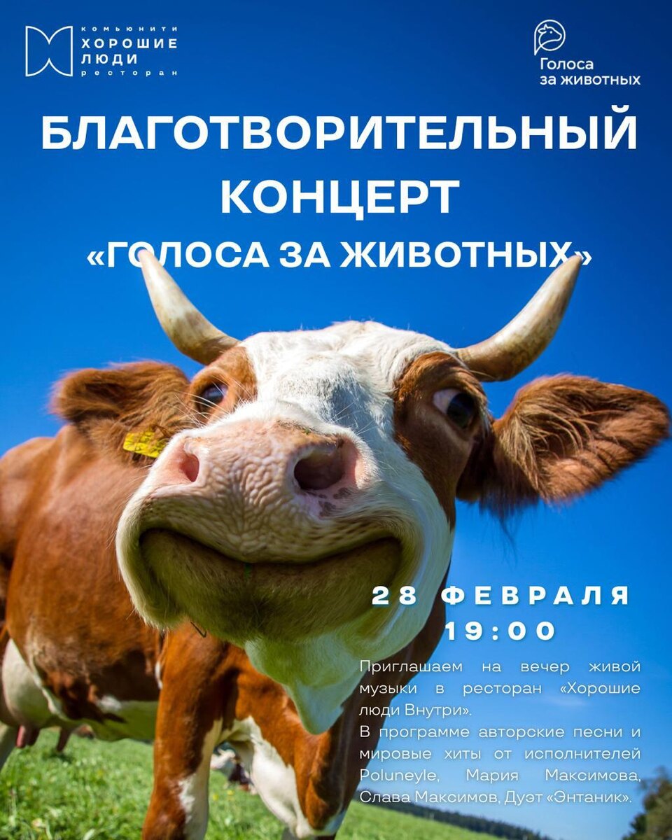 👏 28 февраля в Сестрорецке (Санкт-Петербург) состоится благотворительный концерт в нашу поддержку. Деньги с продажи билетов пойдут на создание документального фильма о жизни коров на российских фермах. Ресторан «Хорошие люди внутри» на берегу Финского залива предоставляет пространство, где можно будет не только послушать музыку, но и узнать, как сейчас живут животные в сельском хозяйстве и почему им так нужна наша поддержка. В программе вечера — Живая музыка! Для вас играют Poluneyle, Мария Максимова, Слава Максимов и дуэт «Энтаник» — Уютный зал с камином и видом на залив — Вкусная этичная еда от ресторана 🚀 Сейчас мы готовимся к созданию честного фильма о коровах. Это история о тех, кто остаётся за кадром рекламы и этикеток. О том, как устроена их жизнь на фермах, через что им приходится проходить и почему они, как и любые другие животные, заслуживают защиты. Сбор материала, монтаж, озвучка и продвижение требуют средств. Ваше участие в концерте — это вклад в то, чтобы правда ст
