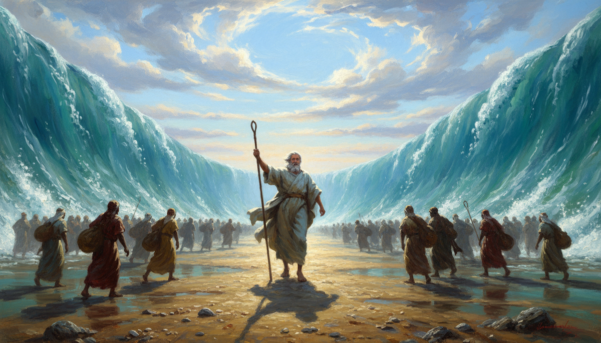 Возьмём самый известный эпизод из книги Исход. Моисей поднимает жезл — и воды расступаются. Израильский народ идёт по сухому дну, а фараоново войско поглощает возвратная волна.