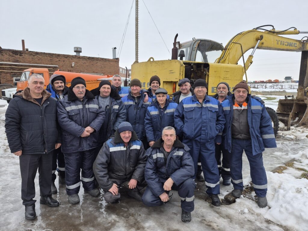На снимке: специалисты МУП «Мясниковское ВКХ» (справа налево): сидят — А. С. Оланян и А. М. Рудой; стоят — К. О. Явруян, А. А. Хочкиян, К. К. Гайбарян, Г. В. Майкоглуян, Т. В. Симавонян, Т. С. Согомонян, В.А. Бабиян, Е. Е. Бардахчиян, В. М. Барнагян, С. А. Асланян, А. С. Сарабашян, В. Г. Обаян.
