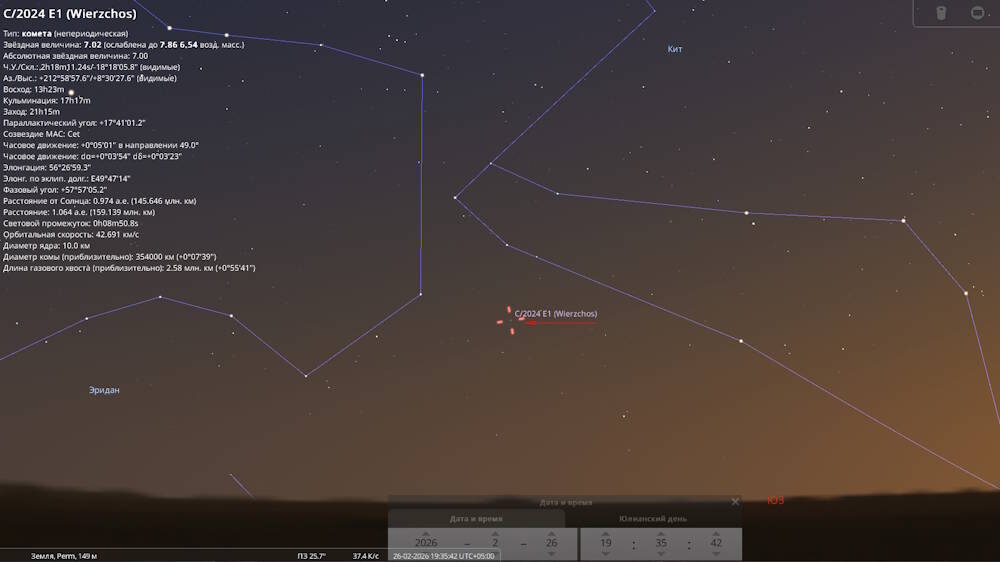 С 26 февраля наступают наилучшие условия для астрофото и наблюдений кометы C/2024 E1 (Вежчоса). Считается, что это самая яркая комета года – её блеск составит около 8-й звездной величины. В ближайшие дни комета подойдет на минимальное расстояние к Земле и станет видимой для наблюдателей в Северном полушарии. Комету можно увидеть низко над юго-западным горизонтом примерно через час после заката. Для фотографий и наблюдений желательно использовать бинокли или телескопы на окраине города или вдали от искусственного освещения.