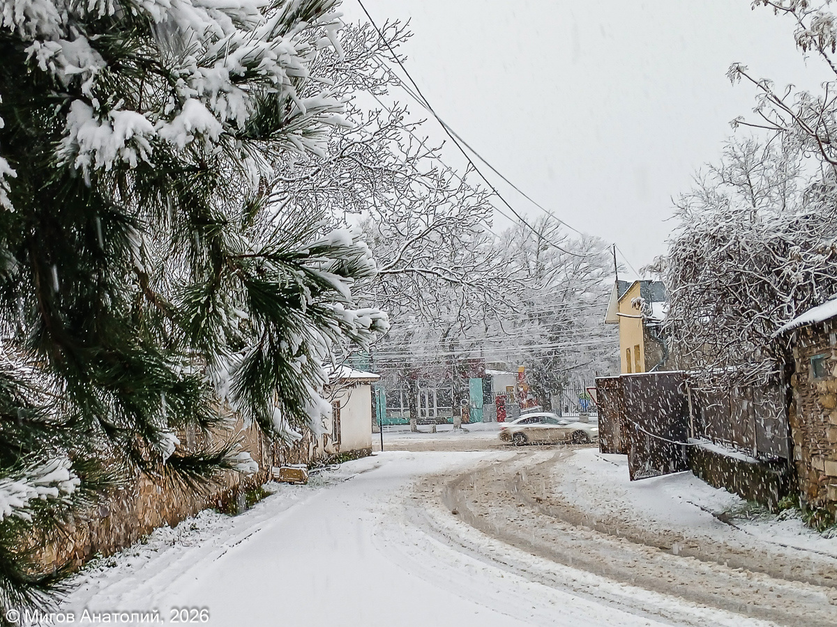 Природу не обманешь, четвертая зима в Старый Крым всё-таки пришла. Она всегда приходит в конце февраля-начале марта. Старожилы вспоминают, что однажды это случилось на 8 марта. Снегу навалило столько, что весь транспорт, стоял, а чтобы хоть как-то пробить дорогу, военные пригнали танки. Народ шёл на работу, утопая по пояс в снегу. Надеюсь, ничего подобного на этот раз не случится, хотя снег вчера валил с самого утра и до самого вечера. Кошки не сразу решились выйти из дома. Долго сидели у окна и примеривались, стоит ли? Но в итоге естество своё взяло, и как ни крути, без утреннего променада никак. Следом и мы с Тильдой вышли, чтобы сделать несколько кругов по свежевыпавшему снегу. Сегодня тут ещё никто не ходил. Будем пробивать тропу. Снег валит крупными хлопьями и не думает останавливаться. Ветки кипарисовиков согнулись под снежной тяжестью. А вот голубые ели не поддаются снегу, стоят бодро. Цветущий кизил засыпает снегом. Цветочные почки кизила еще не успели как следуют распустить