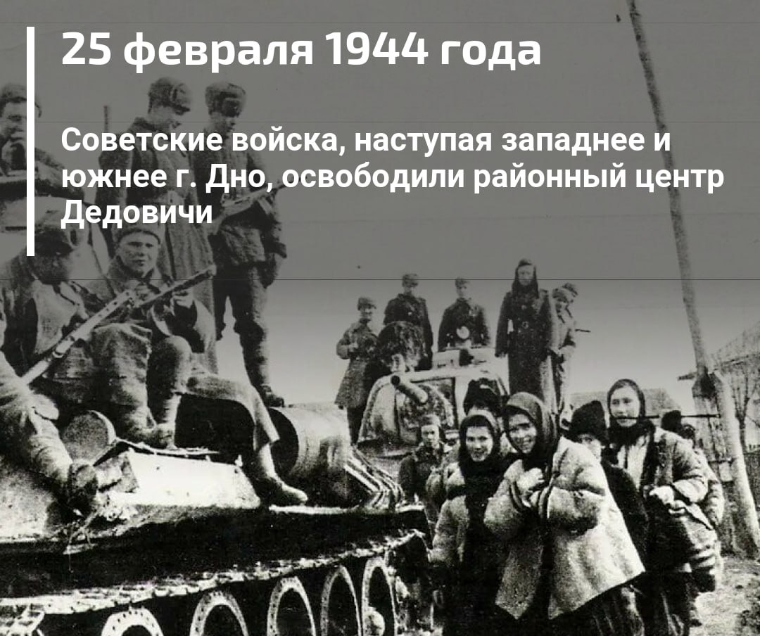 Дно, освободили районный центр Дедовичи. 25 февраля 1944 года в ходе Старорусско-Новоржевской наступательной операции части Ленинградского и Второго Прибалтийского фронтов вместе с партизанами освободили районный центр Дедовичи от немецко-фашистских захватчиков. Дедовичский район в годы войны был одним из центров партизанского движения, здесь находился Легендарный Партизанский край. Партизаны вели разведку и передавали оперативные данные частям Советской Армии, уничтожали карателей, предателей, взрывали мосты и склады с боеприпасами, пускали под откосы эшелоны, громили вражеские гарнизоны. Районный центр Дедовичи являлся важным стратегическим объектом для фашистов — причина этому река Шелонь, природная оборонительная преграда и крупная железнодорожная станция, важная артерия для транспортировки грузов. В сообщении о боевых действиях говорилось: «Крупные соединения ленинградских партизан под командованием товарища Юрцева и товарища Поруценко вместе с передовыми частями Красной Армии