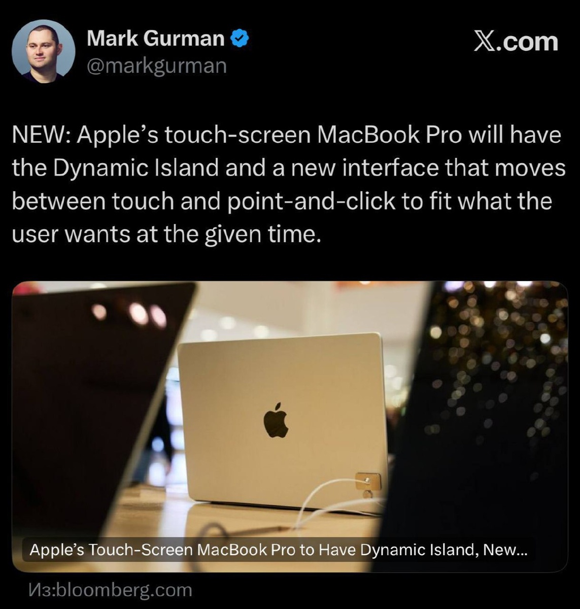 В новых моделях MacBook Pro вместо «чёлки» появится Dynamic Island. Об этом сообщил Марк Гурман. Устройство получит сенсорный экран с поддержкой жестов из iPad, включая: • масштабирование щипком, • быстрый скролл, • другие жесты. Релиз ожидается осенью. На мартовской презентации MacBook Pro не представят. https://dzen.ru/id/5c0e38ff46ef5c00aaa80527