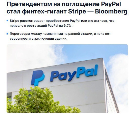 Π°ΠΊΡΠΈΠ²ΠΎΠ², ΡΠΎΠΎΠ±ΡΠΈΠ» Bloomberg ΠΠΊΡΠΈΠΈ #PYPL ΠΏΠΎΡΠ»Π΅ ΠΏΡΠ±Π»ΠΈΠΊΠ°ΡΠΈΠΈ Π°Π³Π΅Π½ΡΡΡΠ²Π° ΡΠ΅Π·ΠΊΠΎ ΠΏΠΎΠ΄ΡΠΊΠΎΡΠΈΠ»ΠΈ ΠΈ Π·Π°Π²Π΅ΡΡΠΈΠ»ΠΈ ΡΠΎΡΠ³ΠΈ 24 ΡΠ΅Π²ΡΠ°Π»Ρ ΡΠΎΡΡΠΎΠΌ ΠΏΠΎΡΡΠΈ Π½Π° 7%. Π ΠΏΠΎΠ½Π΅Π΄Π΅Π»ΡΠ½ΠΈΠΊ Π±ΡΠΌΠ°Π³ΠΈ ΠΊΠΎΠΌΠΏΠ°Π½ΠΈΠΈ ΠΏΠΎΠ΄ΠΎΡΠΎΠΆΠ°Π»ΠΈ Π½Π° 5%, ΠΊΠΎΠ³Π΄Π° Bloomberg Π²ΠΏΠ΅ΡΠ²ΡΠ΅ ΡΠ°ΡΡΠΊΠ°Π·Π°Π», ΡΡΠΎ ΠΎΠ½Π° ΠΏΡΠΈΠ²Π»Π΅ΠΊΠ»Π° ΠΏΠΎΡΠ΅Π½ΡΠΈΠ°Π»ΡΠ½ΡΡ
