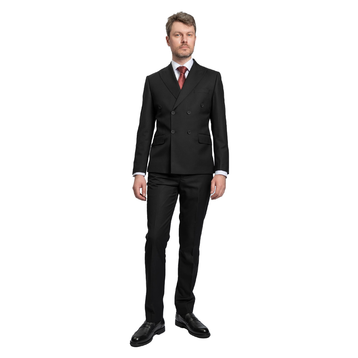 Вершина классической моды и мужской харизмы. Модель — это безупречный двубортный костюм в глубоком черном цвете. Такой фасон традиционно считается наиболее статусным и формальным, идеально подходя для самых значимых событий: от официальных приемов и свадеб до важных бизнес-переговоров. Приталенный крой и два ряда пуговиц создают мощный, атлетичный силуэт, подчеркивая линию плеч. Почему модель станет вашей визитной карточкой: