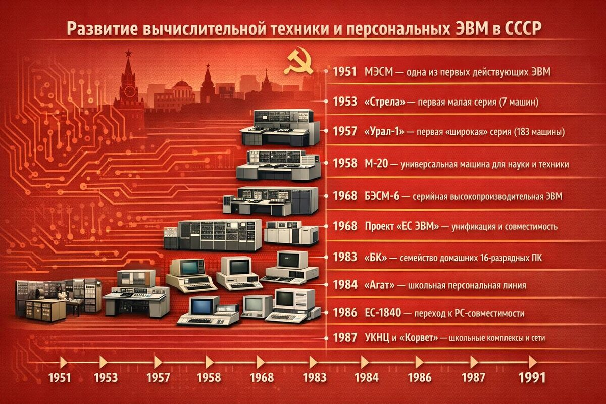 Ниже — хронология ключевых проектов и моделей с их назначением, характеристиками, производителями и «массовостью», а также объяснение, почему в одних местах СССР обгонял мировую планку (научные машины), а в других — заметно отставал (компонентная база и потребительский рынок).