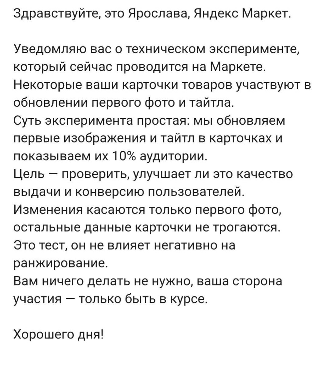 Просто «эксперимент». Продавцам Яндекс.Маркета пришло письмо: площадка проводит технический эксперимент. Суть простая — Маркет сам меняет первое фото и название товара в карточке и показывает новую версию 10% аудитории. Чтобы проверить, «улучшает ли это конверсию». Продавцу делать ничего не нужно. Просто быть в курсе. Теперь вопрос. Фото и тайтл — это 80% клика. Это то, за что селлеры бьются месяцами: пересъёмки, дизайн, SEO, тесты. И тут площадка говорит: мы чуть-чуть поменяем и посмотрим. А если конверсия просядет? А если выручка упадёт? А если это ИИ «улучшил» так, что стало хуже? Ответа нет. «На ранжирование не влияет». По сути это A/B-тест за счёт продавца. Маркетплейсы всё чаще воспринимают карточку как свой актив, а не как инструмент селлера. Интересно, где граница: карточка — это уже полностью собственность платформы? Или всё-таки бизнес продавца внутри неё тоже должен учитываться? Marketplace_biz - отдай свой буст каналу