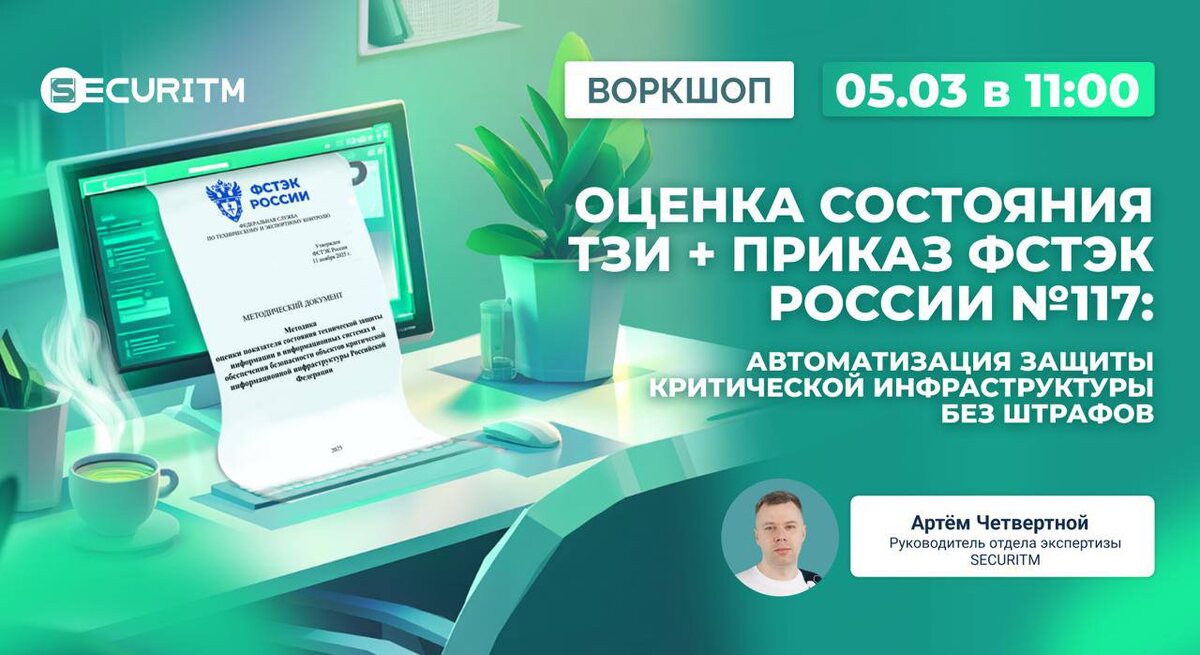 ⬜️⬜️⬜️⬜️ Практический воркшоп: Оценка состояния ТЗИ + Приказ ФСТЭК России № 117 Требования ФСТЭК России по технической защите информации (ТЗИ) ужесточаются: с 2025 г. регулятор может требовать настройки СЗИ, журналы событий, протоколы аудита + ко всему Пункт 32 Приказа ФСТЭК России №117 обязывает проводить оценку раз в 6 месяцев и начиная с 1.08.2026 подавать первые отчеты. 🔥 Как каждый раз не делать это вручную и не тратить на сборы 2 недели? 5 марта в 11:00 приглашаем на воркшоп где мы превратим подготовку к проверкам ФСТЭК из аврала в автоматический процесс. Артём Четвертной, руководитель отдела экспертизы SECURITM, на практике покажет: ✅ Связка «Метрики → Меры → Требования»: Сквозной процесс от технических показателей до выполнения требований ФСТЭК России. ✅ Управление свидетельствами: Как вести учет всех свидетельств аудита и документации по ИБ в одном месте. ✅ Отчетность «в три клика»: Как быстро формировать необходимые по Методике ТЗИ и Приказа ФСТЭК России №117, делая это