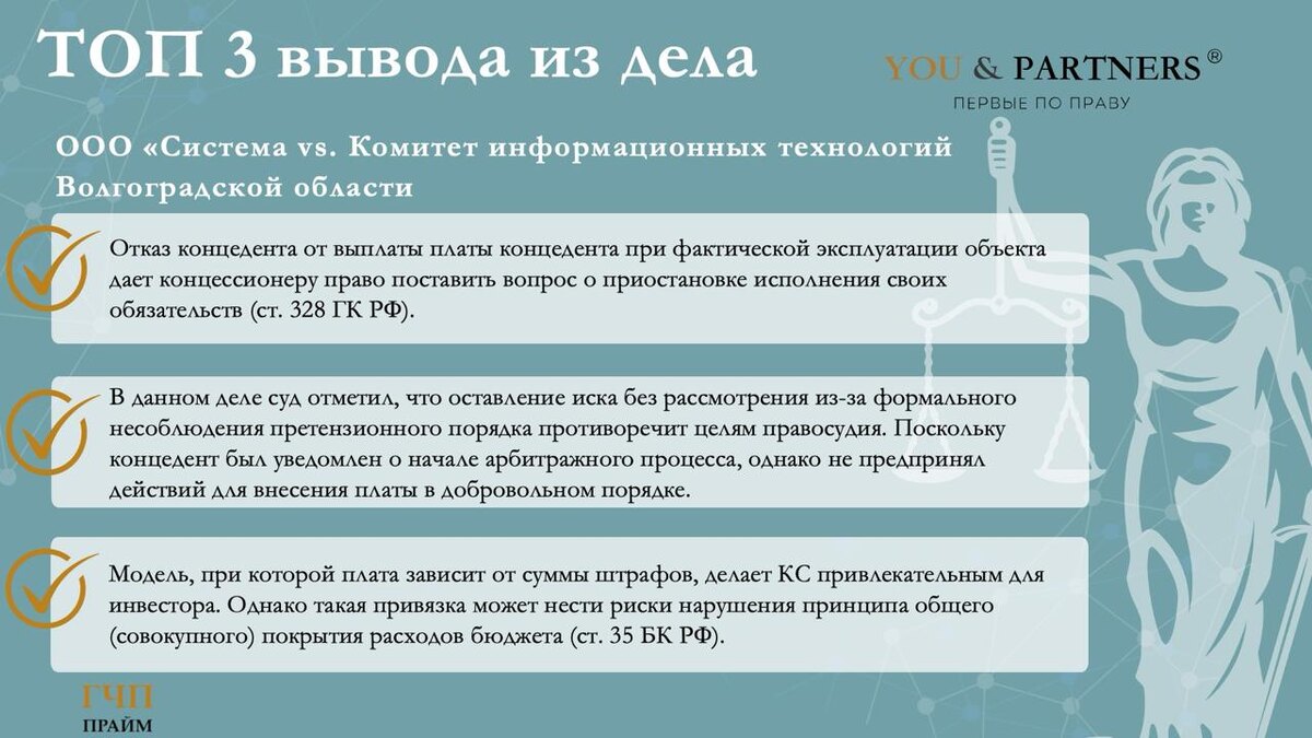 Команда You & Partners проанализировала решение Арбитражного суда Волгоградской области по делу № А12-30213/2025. 🟢 Суть спора: ООО «Система» (концессионер) обратилось в суд с иском к Комитету информационных технологий Волгоградской области (концедент) о взыскании задолженности по КС от 26.02.2020 в отношении создания и эксплуатации объектов ИТ и технических средств фотовидеофиксации нарушений ПДД. Истец требовал оплатить плату концедента за период с июля по октябрь 2025 года, а также проценты за просрочку. Позиция сторон: 🤚Концедент: иск не признал, ссылаясь на отсутствие оснований для ответственности и несоблюдение истцом претензионного порядка. По существу долга возражений, исходя из текста решения суда, заявлено не было. 🤚Концессионер: настаивал на выполнении своих обязательств по концессии и требовал оплаты за период июль-октябрь 2025 года, рассчитанной от суммы штрафов, вынесенных с помощью созданных объектов КС. Суд первой инстанции удовлетворил иск в полном объеме, сделав с