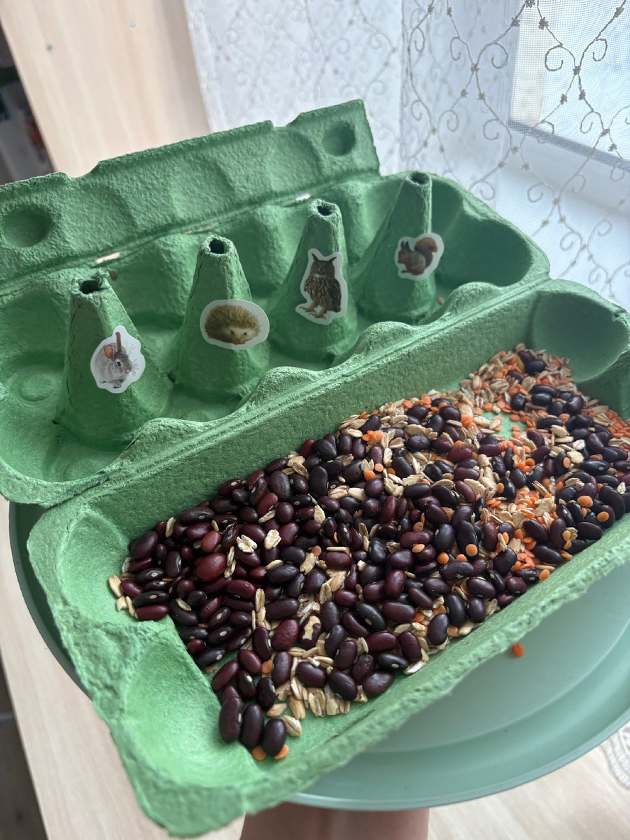 Идея проста: кормим лесных животных и птиц. Сортируем крупы и семена по ячейкам. Ребенок в восторге, мама свободна 20 минут, а польза для мелкой моторики колоссальная!