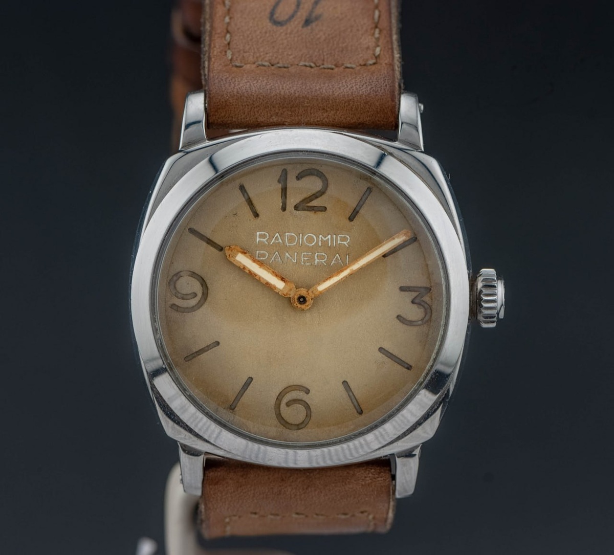 На циферблате нанесена минималистичная разметка: арабские цифры на 3, 6, 9 и 12 часах и надпись "RADIOMIR PANERAI". С годами оригинальная радиоактивная люминесцентная масса на основе радия, которая и дала название модели, неизбежно разрушалась и изменяла цвет . Сегодня эти циферблаты приобрели потрясающую патину, цвет которой варьируется от кремового и золотистого до глубокого коричневого, что и представляет собой главную эстетическую ценность для коллекционеров . Белая часовая стрелка и тонкая синяя минутная стрелка, характерные для модели, также покрыты патиной, добавляя шарма .