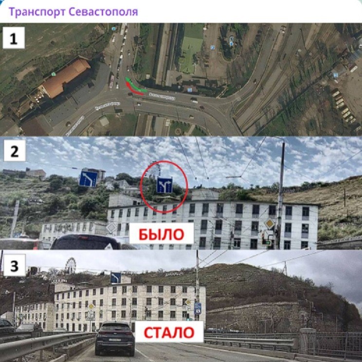 Речь о перекрёстке при съезде с моста с Корабельной стороны в направлении спуска Котовского и центра города. Раньше там висели два знака, которые чётко распределяли три полосы: с левой можно было уходить на спуск Котовского, с правой — в сторону центра, с центральной — допускалось движение в обе стороны. ✔️В дептрансе пояснили: конструкцию повредило непогодой, поэтому ведомству предстоит закупить новый знак. А пока водителям советуют руководствоваться общими правилами дорожного движения. ✈️Севастополь | Мы в MAX📲