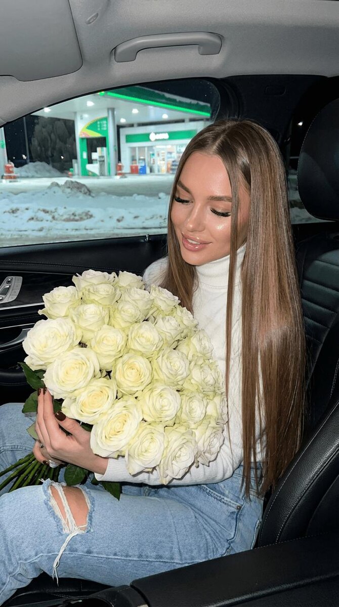 Промт для ИИ: ночное макро-фото девушки в машине с букетом белых роз на заправке зимой