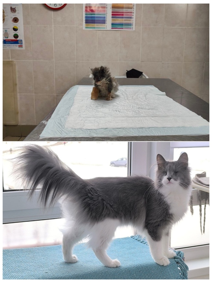 Данный пост написан для того, что возможно, столкнется с таки животным и захочет ему помочь. Один из вариантов успешного лечения. Данного котенка меня попросили спасти в мае 2025 года. Первые фотографии я размещать не буду, там все плохо, неподготовленному человеку на это лучше не смотреть. У котенка было раздут один глаз, другой залеплен гноем. Вес был около 200 грамм, хотя уже были зубы. Котенок не ел. Температура не определялась. Сначала я просто начала греть при помощи вентилятора в машине, пока ехала к аптеке. В аптеке я купила физраствор, глюкозу 50% и 5%, хлоргексидин, капли и мазь (флоксал, тобрекс), ватные диски, шприцы. Уколола глюкозу 5% по весу под холку, в рот накапала 50% глюкозы. Обработала морду и глаза ватным диском при помощи хлоргексидина. Отвезла домой и стала караулить днем и ночью. Постоянно на грелке. Насильное кормление. Возила повсюду с собой. Просыпалась раз в 2 часа ночью. На раздутый глаз я капала глюкозу 50% и капли, которые были куплены. Глаз сдувался. Ват