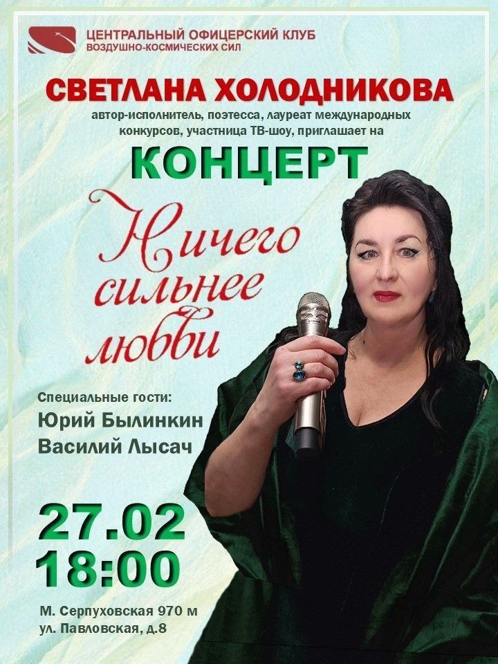 Получил приглашение от Светланы Николаевны Холодниковой на ее концерт «Ничего сильнее любви» послезавтра (27 февраля, пятница, 18:00) в Центральном офицерском клубе ВКС (г. Москва, ул. Павловская, д.8, метро «Серпуховская», «Тульская»), вход свободный. Делюсь приглашением, планируем семейный культурный выход,