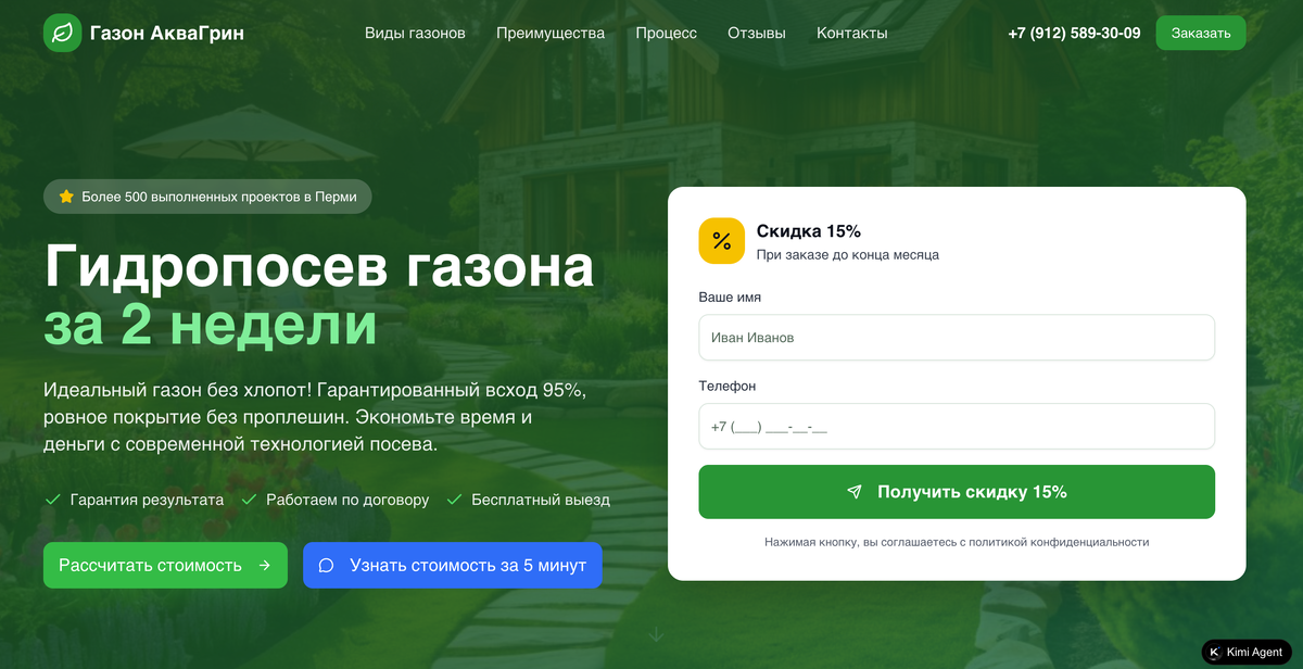 Если у тебя тоже услуга и нет бюджета/времени на студию — попробуй KIMI (kimi.com, ищи Agent Mode или Website Builder).