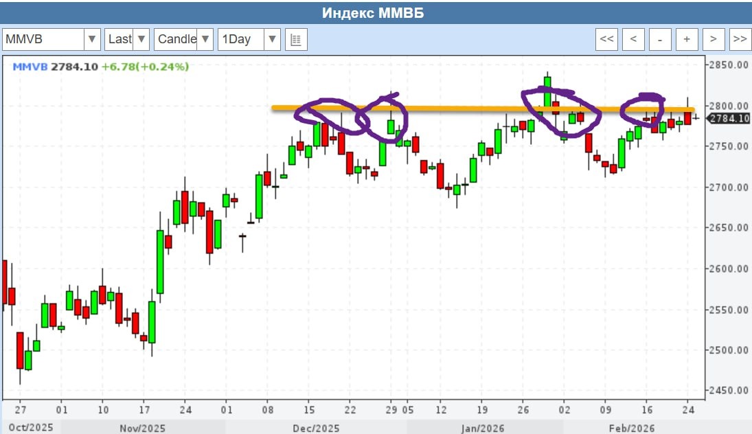 Болтаемся под всё тем же уровнем 2800. Болтаемся под ним мы уже с Декабря, так что даже терминал открывать не хочется. Рынок достаточно сильный, вниз всё таки не идём. Но и выше уровня нас не пускают. Мартовская экспирация всё ближе, если о мире не объявят до неё, не удивлюсь если юрики нас у уровня так до экспиры и продержат, они там рубят бабки уже год.