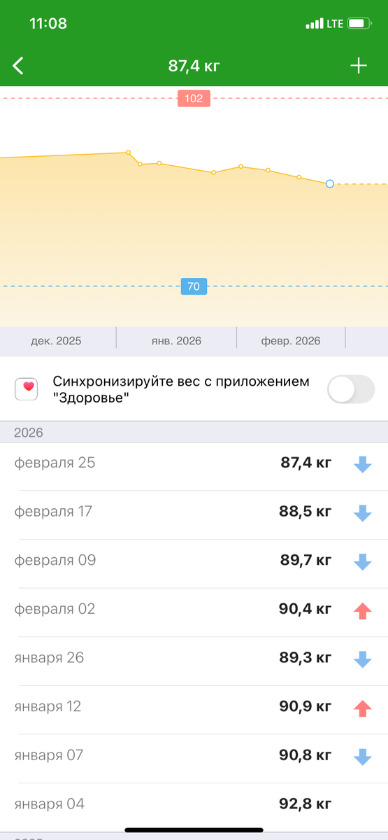 С 1 января удалось скинуть 5,4 кг, а в общей сложности 20 кг, так как изначальный вес был 107 кг, сейчас 87.
