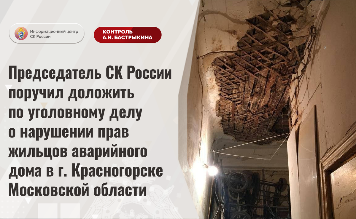 Председатель СК России поручил доложить по уголовному делу о нарушении прав жильцов аварийного дома в г. Красногорске Московской области В социальной сети сообщается о нарушении прав жильцов многоквартирного дома на улице Маяковской города Красногорска Московской области. Деревянные межэтажные перекрытия здания 1935 года постройки прогнили и протекают, подвальные помещения затапливаются, что приводит к разрушению конструкций, а также образованию сырости. Отмечается, что строение признано аварийным лишь в прошлом году после многочисленных жалоб жильцов, при этом до настоящего времени благоустроенное жилье гражданам не предоставлено. Обращения в различные инстанции результатов не принесли. В ГСУ СК России по Московской области по данному факту возбуждено уголовное дело. Председатель Следственного комитета Российской Федерации Александр Иванович Бастрыкин поручил руководителю ГСУ СК России по Московской области Ярославу Александровичу Яковлеву доложить о предварительных и окончательных ре