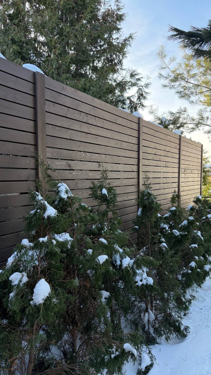 😍Вот Вам идея забора из лиственницы! Из плюсов - проветривается, красиво, натурально! Из минусов: нужно обновлять покрытие, односторонний, дорогой (как и всё в 2026г.)