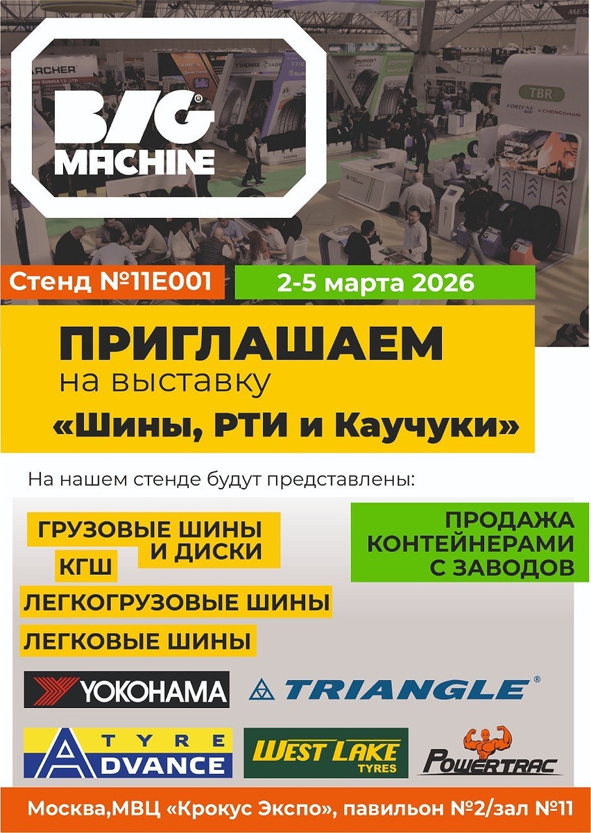 ! Приглашаем вас встретиться лично на выставке «Шины, РТИ и каучуки-2026» Именно здесь соберутся лидеры рынка, чтобы обсудить новые технологии, найти поставщиков и показать свои новинки. 📅 Даты: 2–5 марта 2026 года Деловая программа обещает быть насыщенной: помимо традиционного форума, запланированы сессии Минпромторга России и обсуждение актуальных тем — от логистики до утилизации шин. Мы подготовили для вас актуальные предложения по грузовым, КГШ и легковым шинам. Хотите обсудить сотрудничество, задать вопросы по характеристикам или просто пообщаться лично? Будем рады видеть вас на нашем стенде! 📍 Где встречаемся? Москва, МВЦ «Крокус Экспо», павильон 2, зал 11, стенд №11E001