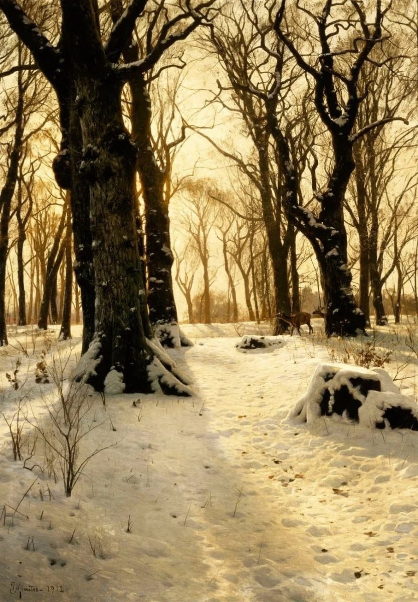 Учился в Королевской академии художеств в Копенгагене, много путешествовал по Европе и Северной Африке, но снова и снова возвращался к одному мотиву - зимнему лесу. Его снег - сложная система оттенков. Солнечный свет отражается от поверхности и дробится на холодные голубые и серые тени. Контраст строится на столкновении золотистого зимнего солнца и плотных, почти синих теневых масс. Он тщательно прописывал каждую ветвь, каждую иглу хвои, ледяную корку на воде. Мёнстед много работал над светом. Снег у него искрится, а стволы деревьев сохраняют тёплый коричневый тон, что усиливает глубину пространства. Он умел показать момент: раннее утро, когда свет только касается верхушек, или закат, окрашивающий снег в теплые оттенки. ____ А вы любите в живописи такую фотографическую точность, или ближе более свободная манера письма?