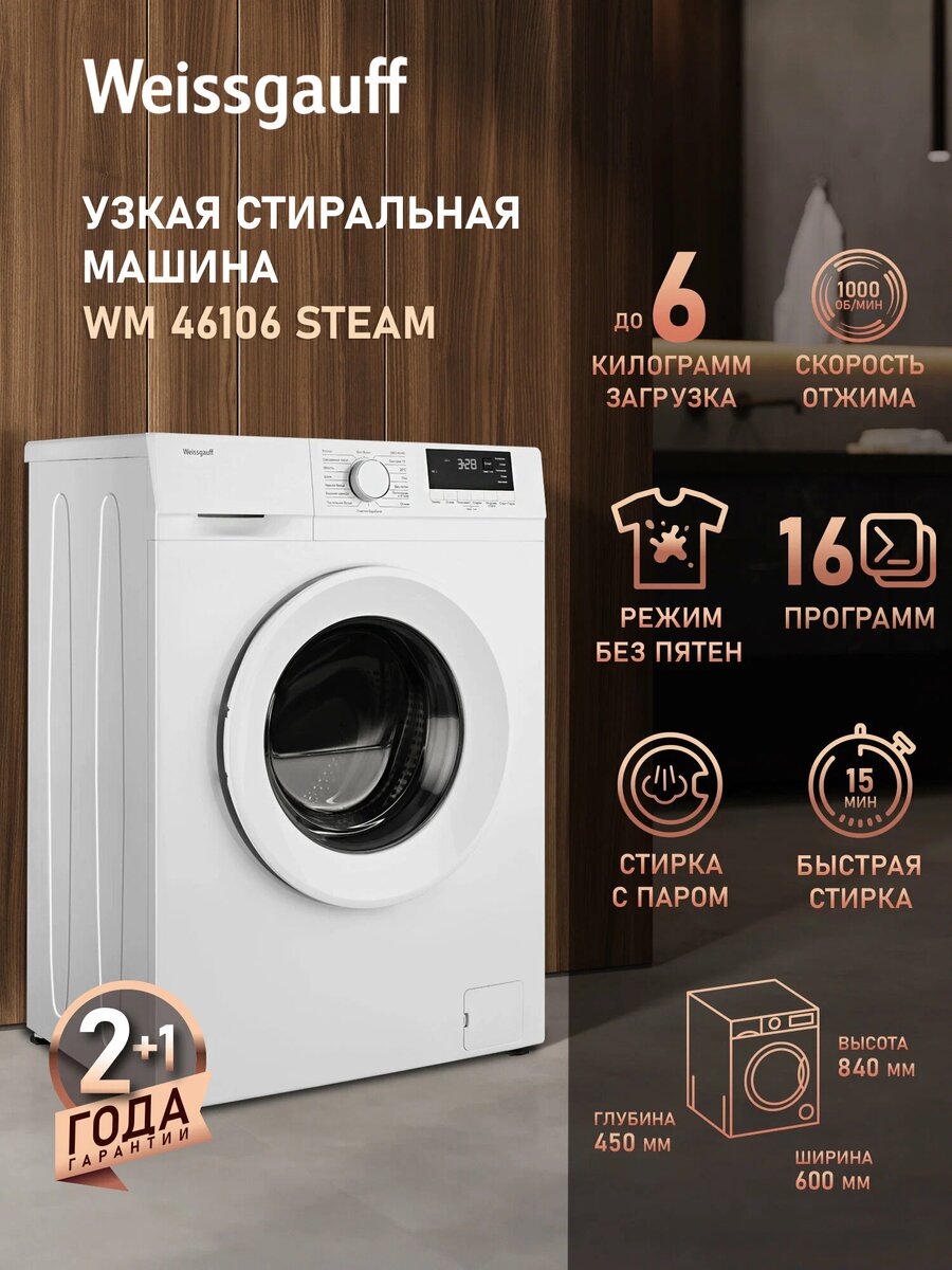 Привет! Расскажу про свою стиралку Weissgauff WM 46106 Steam — пользуюсь ей уже больше 5 месяцев, так что впечатления сложились вполне четкие. Если честно, когда выбирали, основным критерием была глубина. Нашли место только 45 см, а чтобы в остальном машина была нормальная, не урезанная сильно по функциям. Эта модель подошла идеально: и узкая, и загрузка 6 кг для нашей семьи из трех человек — самое то.