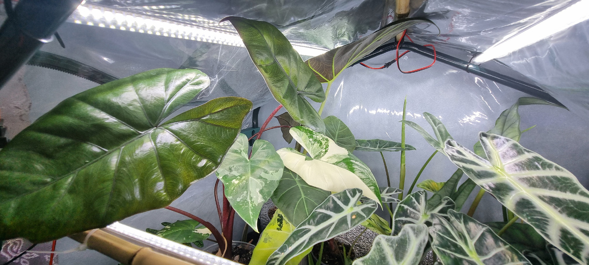 Маленькая теплица — это что-то вроде реабилитационного центра и детского сада в одном флаконе. Тут живут алоказии всех возрастов: клубни, детки, подростки. Кто-то робко выпускает первые корешки, кто-то героически выживает во мху, а кто-то осторожно пробует обживаться в грунте. Но речь сегодня пойдет о подросших алоказиях, и так, вашему вниманию: