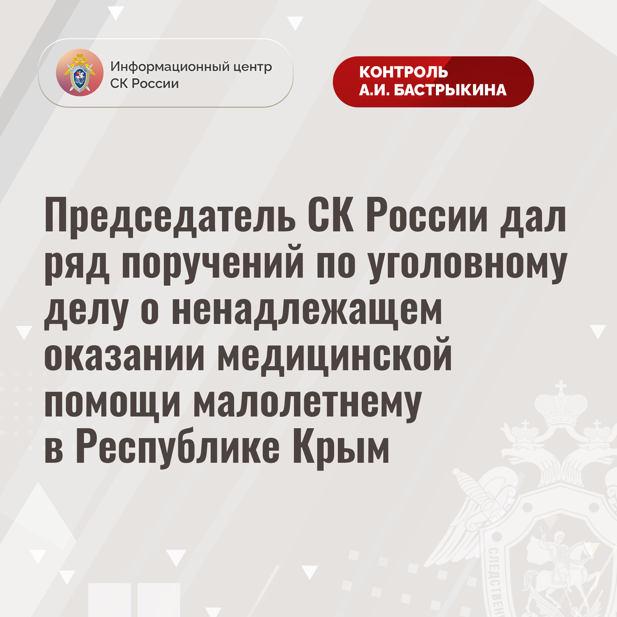 Председатель СК России дал ряд поручений по уголовному делу о ненадлежащем оказании медицинской помощи малолетнему в Республике Крым