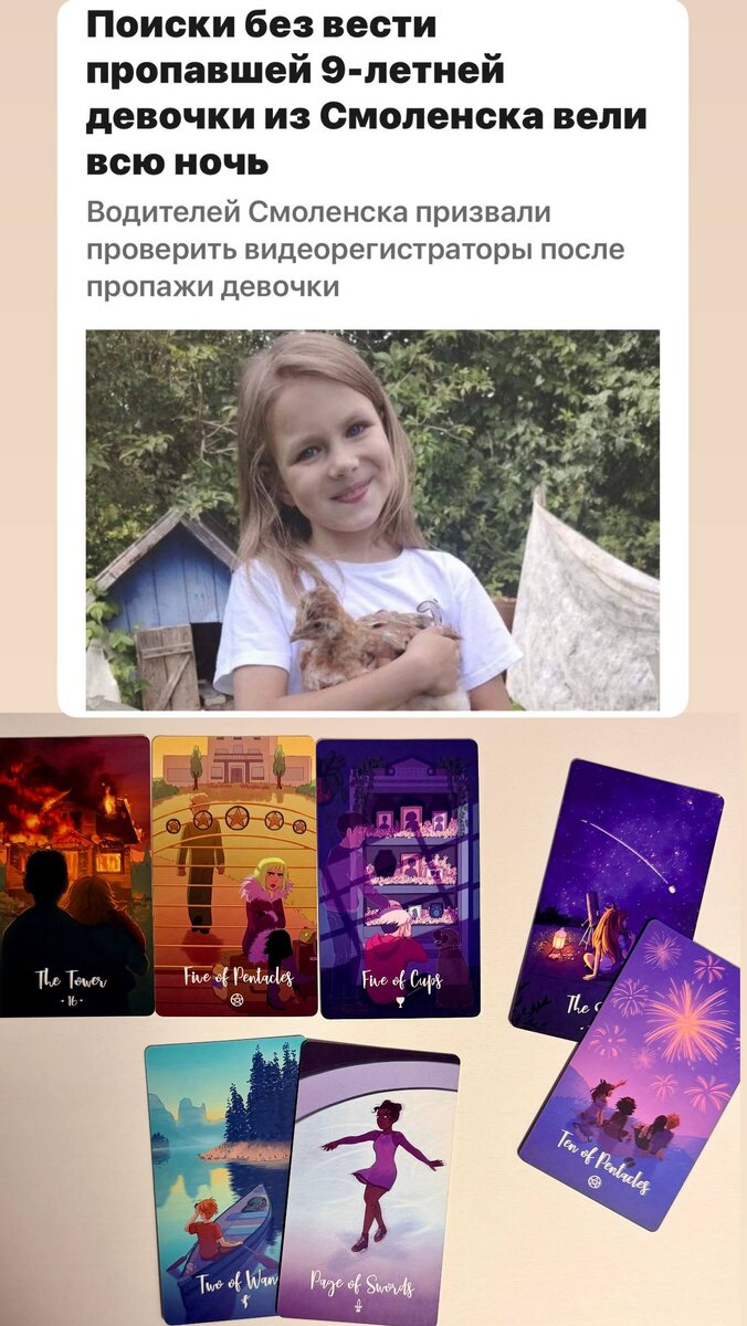 В таких случаях надеешься, что карты скажут что-то хорошее, но первой же позицией — БАШНЯ. Где девочка? По пажу мечей, ребенка скрывают, знают, что его все будут искать (2 жезлов) Башня часто указывает на здания, порой непригодные к жизни, либо в данном случае, на частное жилье. Что произошло? За ребенком следили (паж мечей), продумано время и место (10 пентаклей), скорее всего увели под каким-то предлогом (5 пентаклей), возможно, что-то связано с собакой (5 кубков). Найдут ли? По аркану 5 кубков скорее нет, чем да… тут поминальные таблички и аркан Звезда, понимаете на что намекаю. Про состояние на данный момент — утвердительно жива. Tarotclavem в МАХ