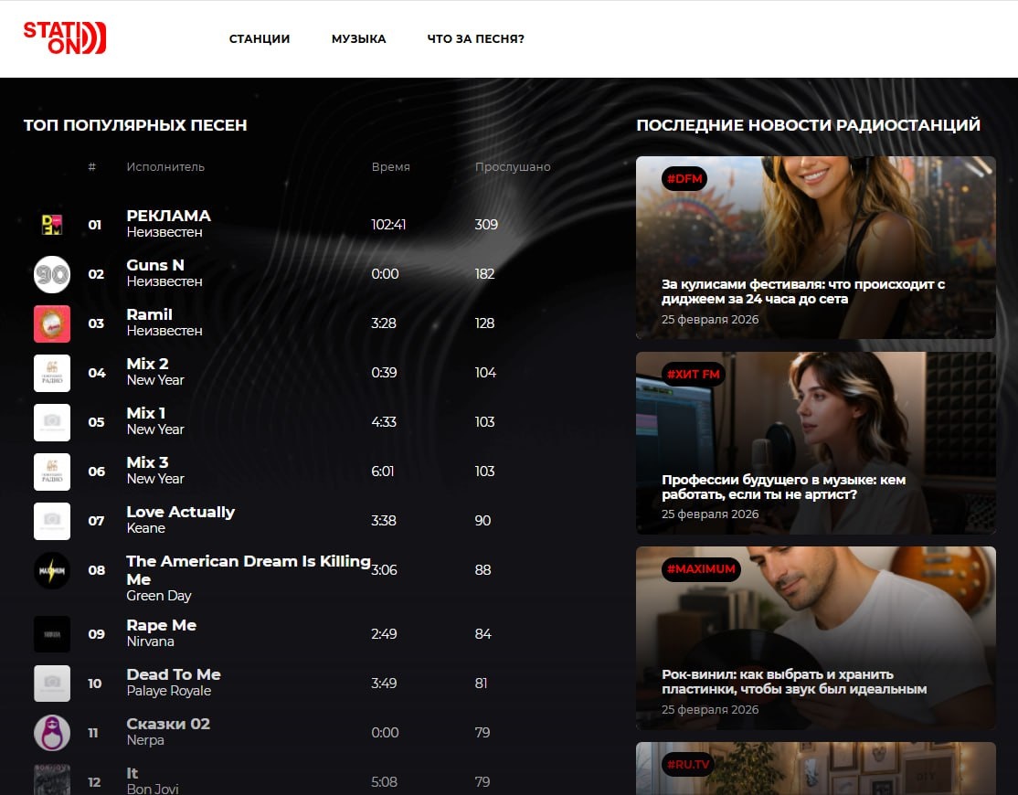 столичной Станции 106.8 (так же известной как «Станция 107 FM»). Станция имела огромное влияние на молодёжь 90х. в начале века была выкуплена и угроблена компанией, которая сейчас называется РМГ. Они запустили ретро-станцию для 40+ Русское Радио 2, потом новостную станцию Русская Служба Новостей. Потом частоту забрал Габрелянов, там была радиостанция Life Звук, потом её отдали НМГ и на частоте запустили бестолковое радио Известия (звук от канала Известия, часто однообразная фоновая музычка без текста), потом частоту занимала недоразвитая Kiss FM, и теперь там Маруся FM (Москва 107.0 FM). А сайт Станции так и остался у РМГ. Раз 400 его переделывали. Уж давно могли из него крутой стриминговый сервис сделать, мегапосещаемый портал, ведь был у РМГ когда-то в управлении магазин mp3-музыки MUZ.RU (этот адрес теперь ведёт на беспонтовый сайт канала МУЗ-ТВ). После закрытия Станции всю аудиторию перетянул на себя Мегаполис FM, который выкупили и угробили ЕМГ, запустив там радио для мёртвых. Одн