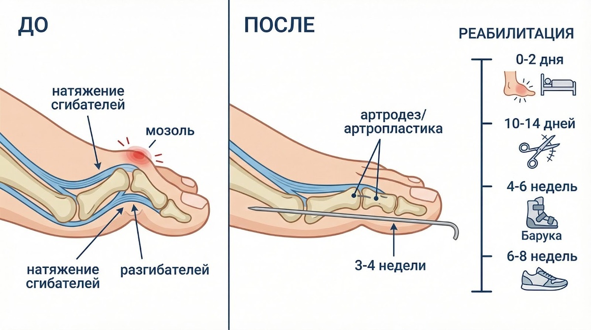 И вот важный момент: операция подбирается не по названию деформации, а по ее типу. Палец может быть гибким (разгибается рукой), ригидным (не разгибается, есть контрактура), с подвывихом/вывихом в суставе у основания, или идти «в комплекте» с другими проблемами стопы (вальгус большого пальца, перегрузка переднего отдела, боли под головками плюсневых костей).