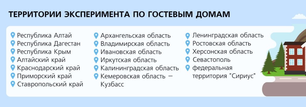 Эксперимент до 31 декабря 2027 года Эксперимент по предоставлению услуг гостевых домов в ИЖС вводится ФЗ-127 от 7 июня 2025 г. "О проведении эксперимента по предоставлению услуг гостевых домов". Он предполагает, что с 1 сентября 2025 года все гостевые дома, действующие на территориях регионов-участников, должны будут подать документы для включения их в единый реестр объектов классификации в сфере туристской индустрии (далее – реестр). Каждому гостевому дому, который соответствует требованиям закона, присвоят идентификационный номер. Начиная с 1 января 2026 года информацию о гостевом доме в интернете, в том числе на сайтах-агрегаторах, разрешат размещать только с указанием этого идентификационного номера и ссылки на запись в реестре. С этой же даты деятельность гостевых домов, не внесенных в реестр, будет запрещена (ч. 4 ст. 4 Закона № 127-ФЗ). Это означает, что владельцы незарегистрированных гостевых домов будут считаться ведущими незаконную предпринимательскую деятельность, за что п