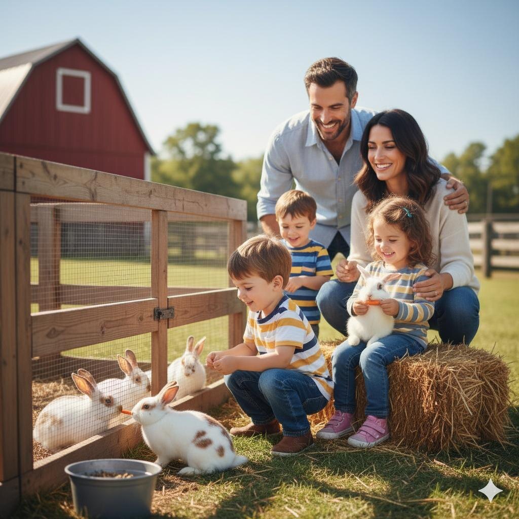 Сгенерировать фото🪄 Сохраните точные черты лица, волосы, глаза, оттенок кожи с референсных изображений. Не изменяйте внешность людей. Семья на ферме, все кормят домашних животных: дети дают морковку кроликам, родители наблюдают рядом. Солнечный день, сельская местность, непринуждённое веселье. Момент обучения и открытий, тёплое естественное освещение. Жанровая фотография, реалистичные детали, живая естественная атмосфера. Согласованность персонажей, сохраняйте ту же идентичность.