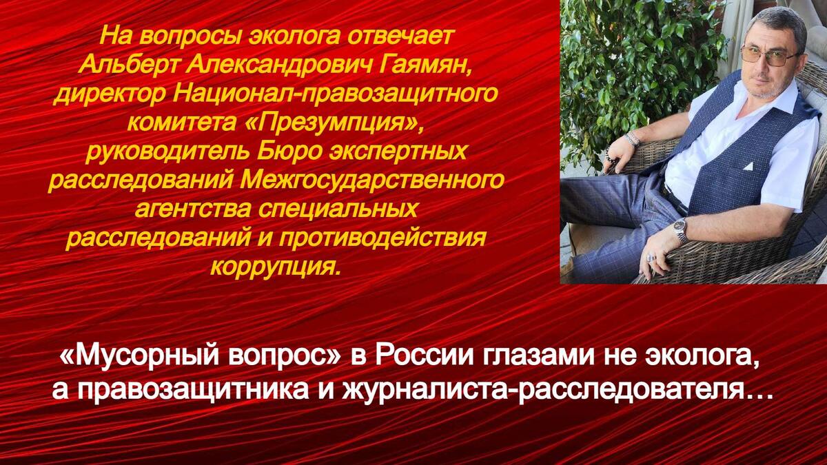 На вопросы эколога отвечает Альберт Александрович Гаямян, директор Национал-правозащитного комитета «Презумпция», руководитель Бюро экспертных расследований Межгосударственного агентства специальных расследований и противодействия коррупция.
