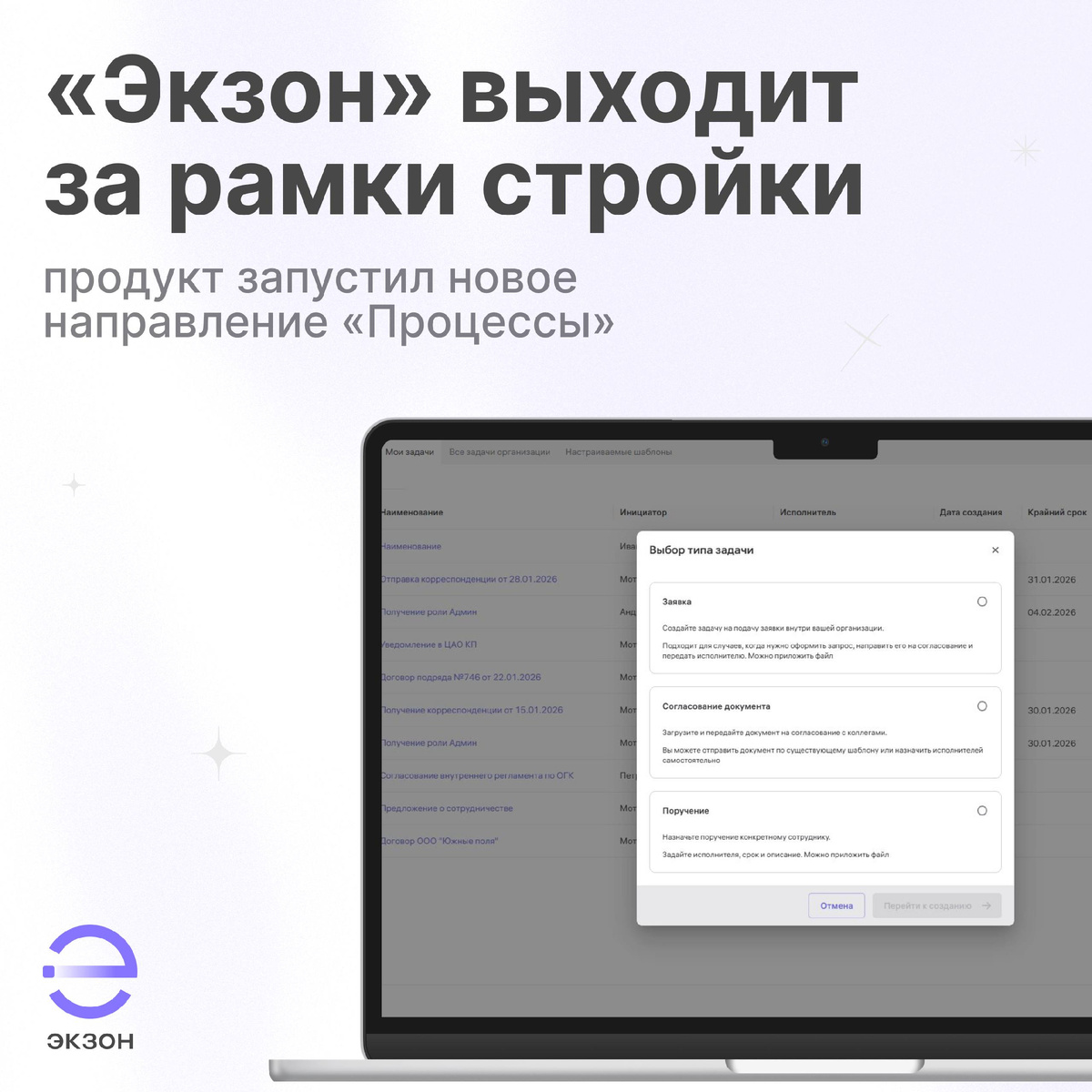 Когда компания внедряет цифровую платформу для стройки, кажется, что главный шаг уже сделан. Проекты под контролем, документы структурированы, акты формируются вовремя. Но очень быстро становится понятно: стройка – это только часть бизнеса. Договоры, служебные записки, заявки на оборудование, поручения после совещаний – всё это продолжает жить в почте, мессенджерах и устных договорённостях. В результате возникает разрыв между стройплощадкой и офисом. Именно этот разрыв мы закрыли, запустив новое направление в «Экзон» – «Процессы». Теперь платформа – это не только управление строительством, а единое цифровое пространство для всей внутренней работы компании. Всё предельно просто. При создании задачи пользователь выбирает один из трёх типов: Никакой сложной логики и перегруженных форм. Человек выбирает понятный формат, а система запускает нужный процесс автоматически. Это принципиально: цифровизация должна упрощать, а не добавлять новые уровни сложности. Один из самых частых сценариев в
