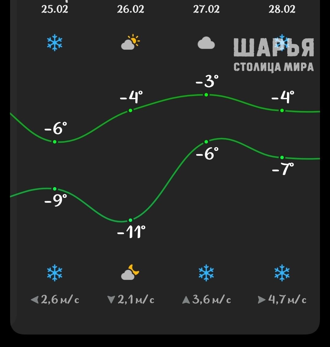 Морозы пока не отступают, но ослабевают. Заключительные дни февраля пройдут с ночным морозцем и небольшим дневным снежком. Однако температура не будет опускаться до по-настоящему зимних отметок. По прогнозам синоптиков, к выходным уже может закапать первая капель: в воскресенье синоптики прогнозируют первый в этом году плюс. Правда, всего +1°С. Снег будет продолжать испытывать нас на прочность. Кроме четверга всё будет обещают снег, а вот после пятницы он может уже превратиться и в дождь. Метеочувствительным людям на этой неделе будет нелегко – с четверга по субботу ожидается сильно повышенное давление. Геомагнитное поле возмущенное. Шарья – столица мира Крупнейшее городское СМИ Источник: Открыть