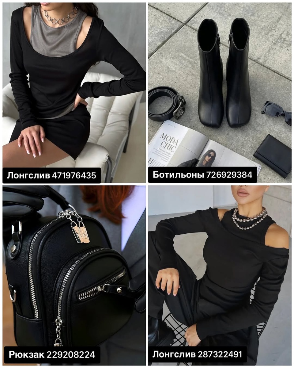 Иногда именно детали решают всё. В последних трёх фото — идеальная мини-капсула в чёрной гамме: выразительный верх, универсальная обувь и функциональный аксессуар.