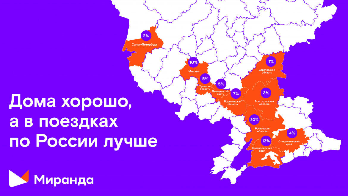 Открывает список популярных мест Ростовская область – около 30% туристов-абонентов «Миранды» посетили регион в новогодние каникулы. Вторые в рейтинге - курорты Краснодарского края – более 13% путешественников отправились туда для встречи главной ночи в году. Ещё одна точка притяжения туристов - достопримечательности центральной части России: Московская область – 10%, Воронежская область – 7%, Липецкая область – 5% и Тульская область – 5%. Следующее место в списке досталось региону Северо-Кавказского федер