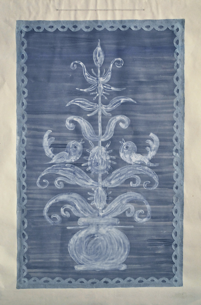 Деревце в мом любимом стиле. Лист ватмана. Гуашь. Окаймляющий узор - из голубых салфеток.