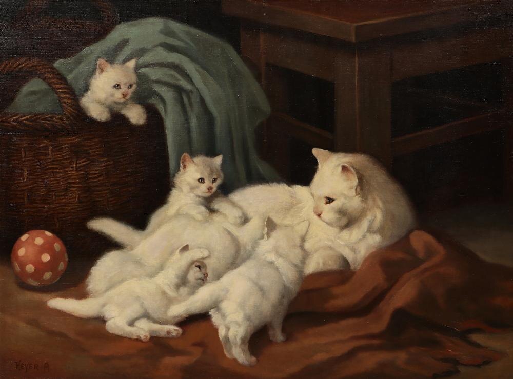 Артур Хейер — один из самых узнаваемых европейских художников-анималистов своего времени. Его произведения, особенно талантливые изображения ангорских кошек, занимают особое место в истории жанровой живописи животных. Хейер, появился на свет в Хархаузене в 1872 году. Он получил классическое художественное образование: с 1890 по 1895 годы Артур обучался в Берлинском училище при Музее прикладного искусства, где его наставником был Макс Фридрих Кох. В 1896 году Хейер переехал в Будапешт, где начал профессиональную карьеру, сначала как иллюстратор, а затем как живописец-анималист. В 1900 году он принял венгерское гражданство, а спустя несколько лет стал одним из ведущих мастеров своего круга: его работы экспонировались на выставках не только в Венгрии, но и в Германии, Австрии и других европейских странах. Портреты кошек заняли в творчестве Хейера центральное место. В них он находил не только декоративный, но и глубоко живой образ: кошки на его полотнах: внимательные, задумчивые, игр