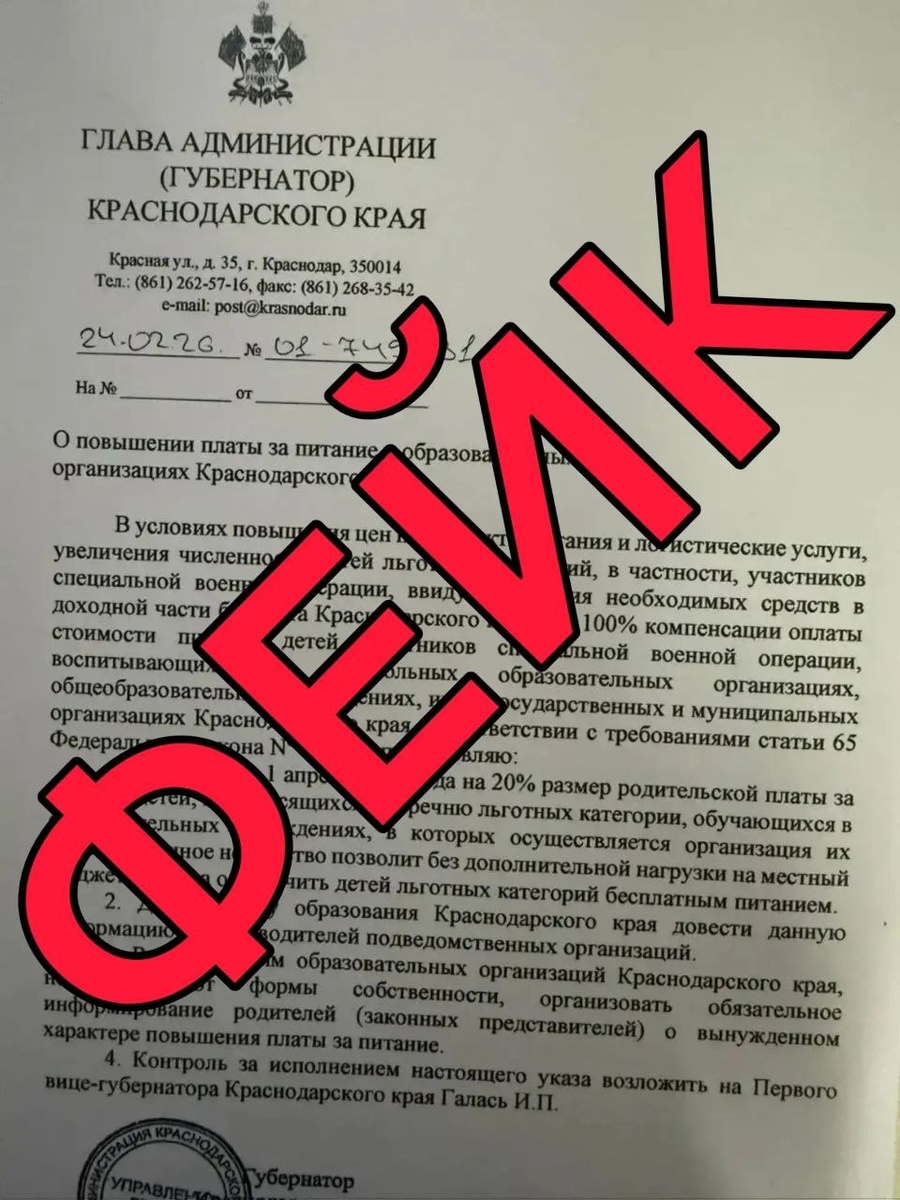 : Внимание, фейк! Администраторам каналов в Телеграм и МАХ, редакциям СМИ рассылают информацию, якобы с 1 апреля 2026 года в образовательных организациях Краснодарского края повысят плату за питание на 20% в связи увеличением численности детей льготных категорий. Правда Публикуемый документ – плохо сделанный фейк, подготовленный с грубыми нарушениями инструкции по делопроизводству. Например, в нем трижды указаны несуществующие должности. В регионе нет должности «главы администрации (губернатора) Краснодарского края», «первого вице-губернатора» и «департамента образования Краснодарского края». Таких формулировок в настоящем документе ни в коем случае бы не было. 👇👇👇