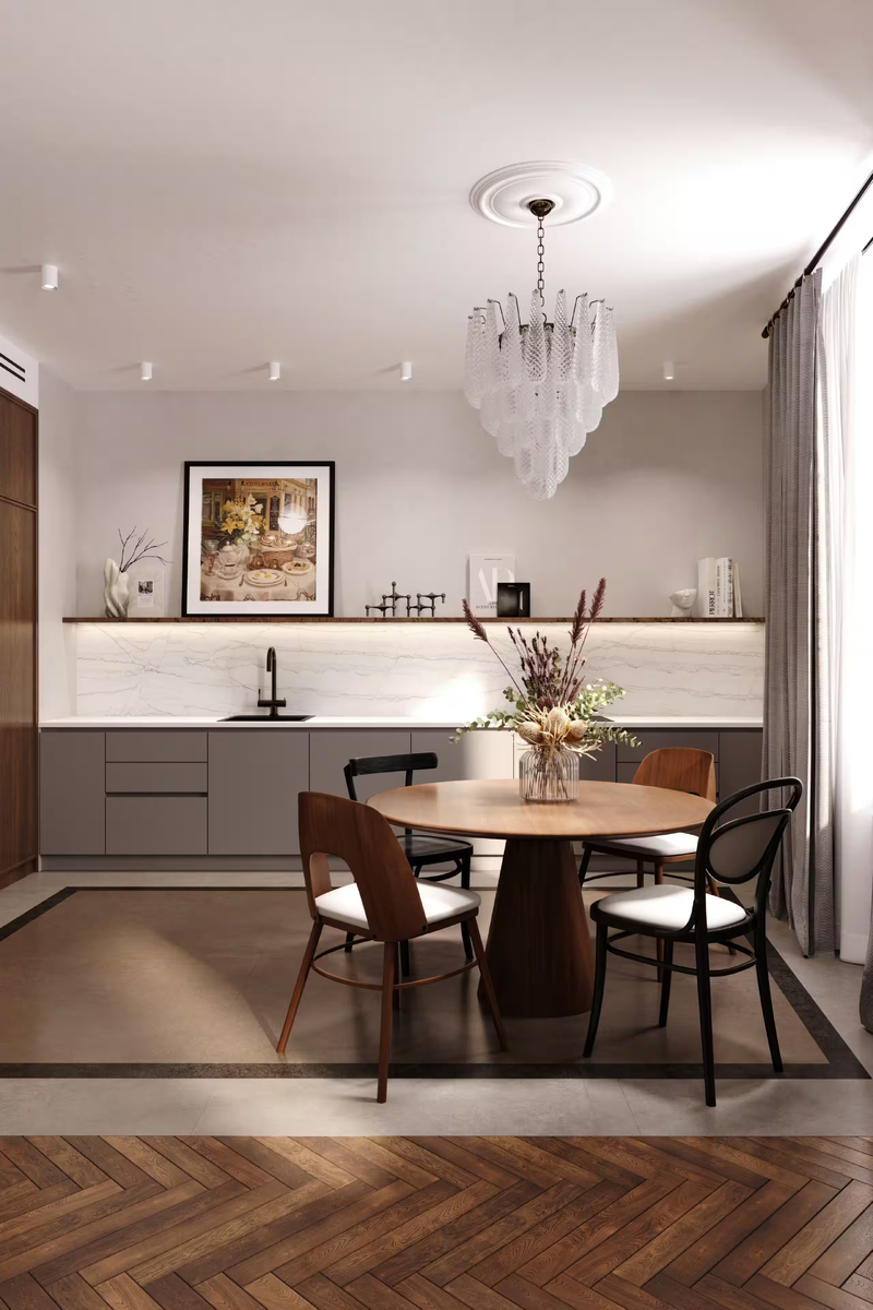 Особый шарм обеденной зоне придают антикварные стулья, каждый из которых имеет свой уникальный дизайн. Эта эклектика, на первый взгляд кажущаяся случайной, на деле продумана до мельчайших деталей. Стулья словно рассказывают свои истории: один напоминает о старинных европейских интерьерах с изогнутыми ножками и резными спинками, другой – о простоте и теплоте с его грубоватой, но очаровательной отделкой, третий украшен мягкой обивкой с винтажным узором, добавляя нотку изысканности.