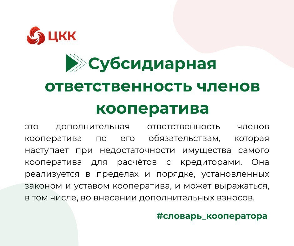 💡 В рамках рубрики мы регулярно разбираем юридически значимые понятия, связанные с деятельностью кооперативов, простым и понятным языком. 💭 Материалы будут полезны пайщикам, руководителям кооперативов и всем, кто интересуется правовыми основами кооперативной деятельности. 📒 В этот раз рассмотрим такое понятие, как «субсидиарная ответственность членов кооператива» — и разберём, когда и в каких пределах она может применяться. Следите за новыми терминами — будет полезно!